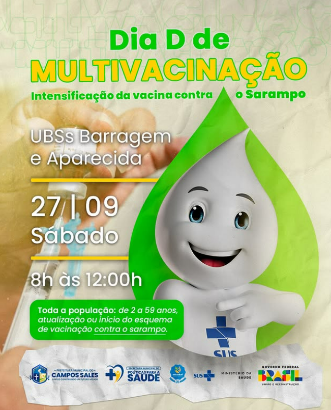CAMPOS SALES: Ação Estratégica Dia D de Multivacinação neste sábado (27) nas Unidades de Saúde dos bairros Barragem e Aparecida, de 8h às 12h