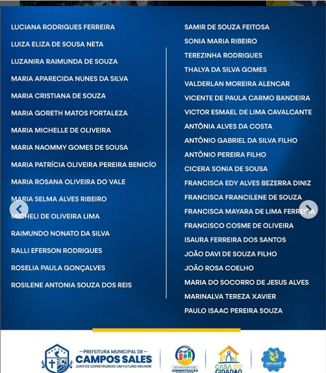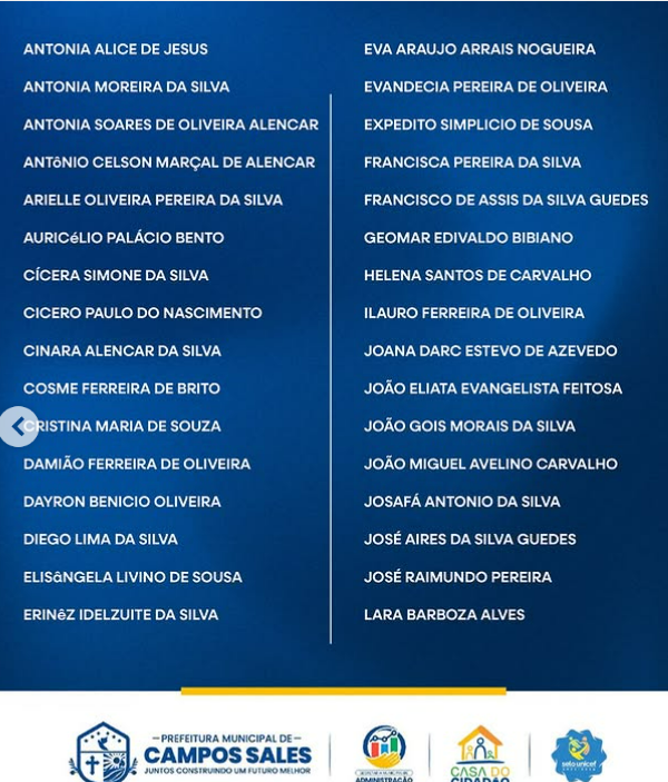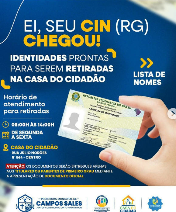 Os documentos feitos através da Casa do Cidadão, já estão prontos para serem retirados. Os nomes citados na lista deverão dirigir-se até a Casa do Cidadão (Rua Júlio Norões, N°564, centro), das 08h às 14h, de segunda a sexta.