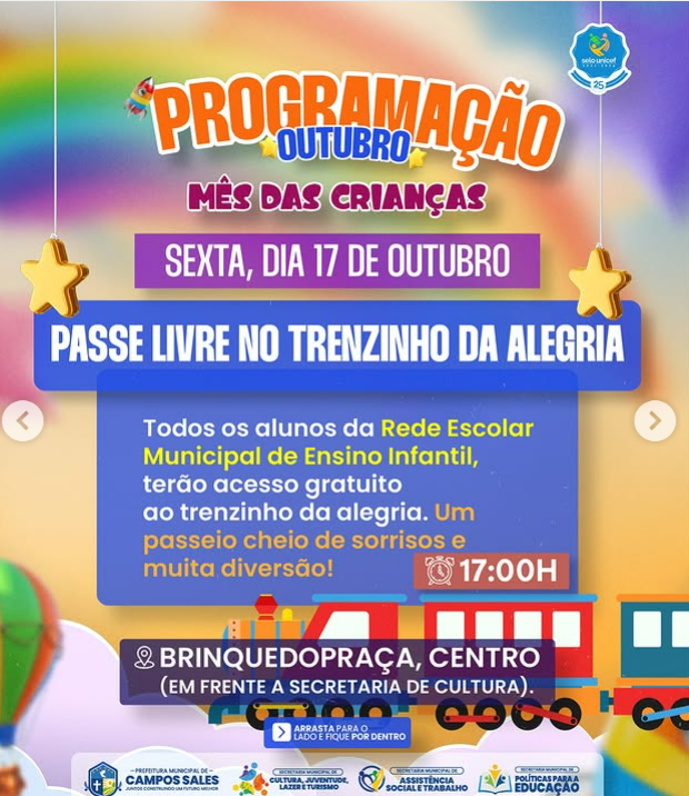 O Governo Municipal preparou uma programação incrívell cheia de alegria, diversão e atividades para comemorar o Dia das Crianças.