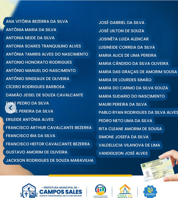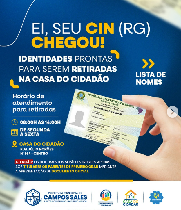 Os documentos feitos através da Casa do Cidadão, já estão prontos para serem retirados. Os nomes citados na lista deverão dirigir-se até a📍Casa do Cidadão (Rua Júlio Norões, N°564, centro), das 08h às 14h, de segunda a sexta.
