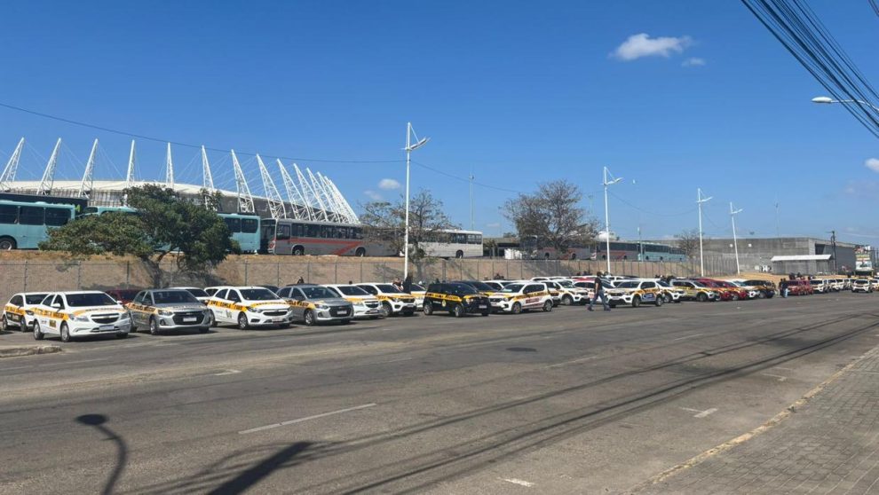 Imagem mostra dezenas de carros de aprendizagem estacionados próximos à Arena Castelão, em Fortaleza, durante protesto de donos e instrutores de autoescola contra o fim da cnh sem autoescola.