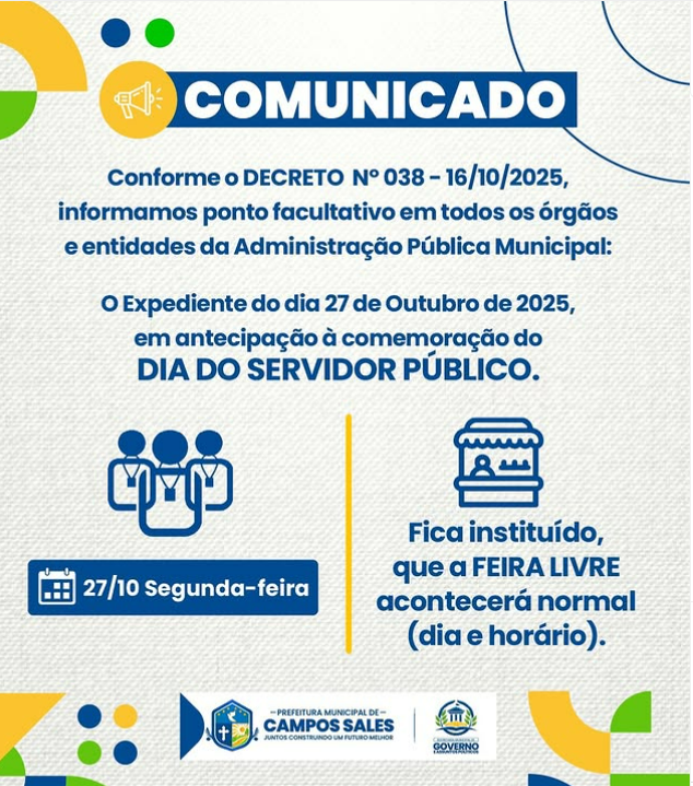 Conforme o DECRETO N° 038 – 16/10/2025, informamos ponto facultativo em todos os órgãos e entidades da Administração Pública Municipal: