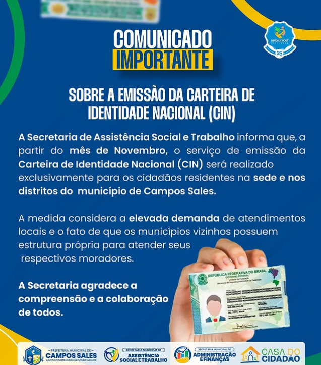 A Secretaria de Assistência Social e Trabalho informa que, a partir deste mês (Novembro), o serviço de emissão da Carteira de Identidade Nacional (CIN) será realizado exclusivamente para os cidadãos residentes no município de Campos Sales.