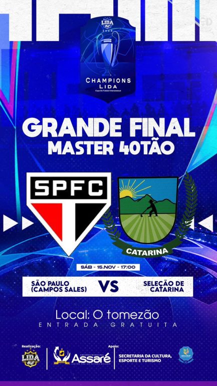 Neste sábado, 15 de novembro tem a final Master da Champions Lida de Assaré, com o jogo envolvendo o São Paulo FC de Campos Sales e A Seleção Master do município de Catarina.
