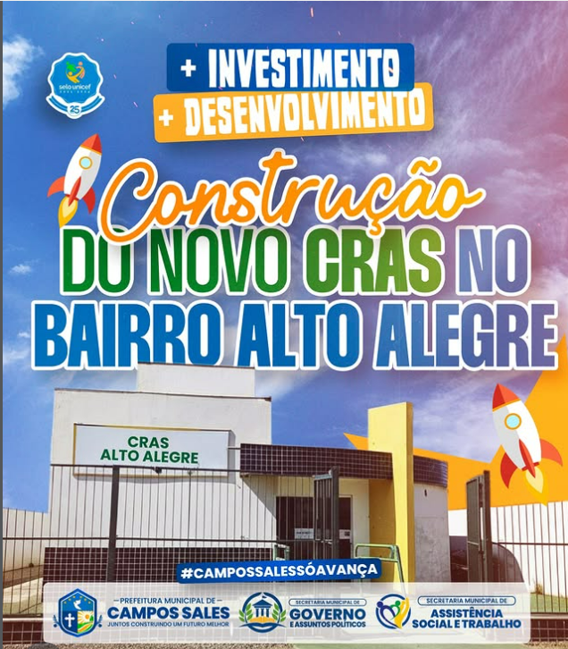 O Governo Municipal tem a imensa satisfação de anunciar a liberação dos recursos junto ao Governo Federal e o INÍCIO DAS OBRAS para a construção do Novo Centro de Referência de Assistência Social (CRAS) no bairro Alto Alegre.