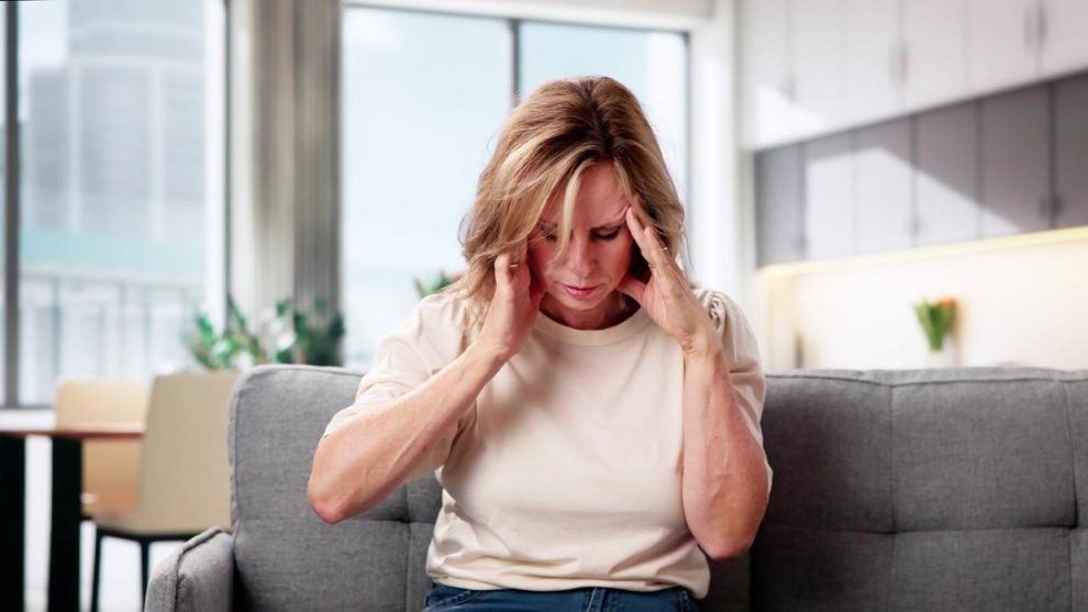 Imagem de uma mulher sentindo dores de cabeça para matéria sobre AVC.
