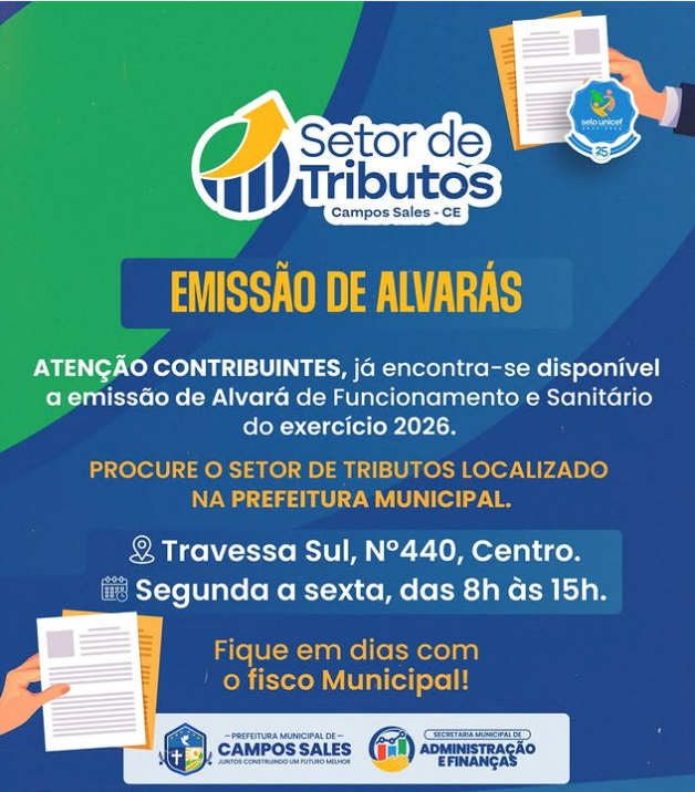 ⚠️ Atenção Contribuintes, já encontra-se disponível a emissão de Alvará de Funcionamento e Sanitário do exercício 2026.
