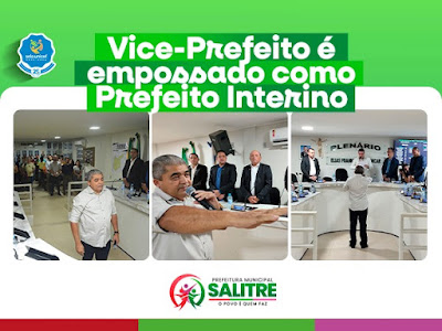 O vice-prefeito de Salitre, Ronaldo Pereira assumiu interinamente o cargo de prefeito interino do município. A posse ocorreu em virtude do afastamento temporário do prefeito Rondilson Ribeiro, que se encontra internado em Fortaleza, se tratando de transplante de medula óssea e está licenciado por 30 dias.
