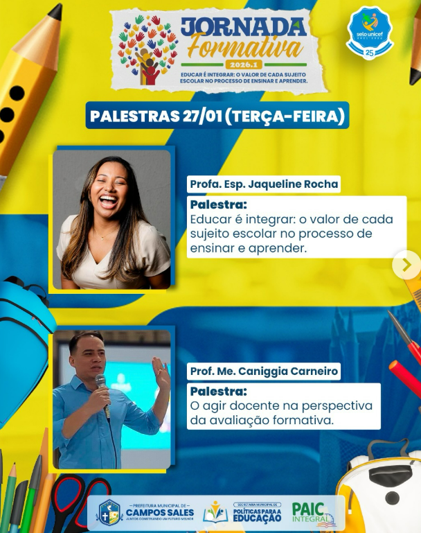 É com imensa satisfação que a Secretaria Municipal de Políticas para a Educação, apresenta os palestrantes da Jornada Formativa 2026.1. Serão dois dias de interação, integração e aprendizagem, que refletirá de forma direta no avanço significativo da educação em Campos Sales.