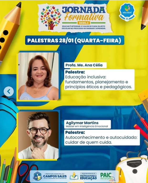 É com imensa satisfação que a Secretaria Municipal de Políticas para a Educação, apresenta os palestrantes da Jornada Formativa 2026.1. Serão dois dias de interação, integração e aprendizagem, que refletirá de forma direta no avanço significativo da educação em Campos Sales.