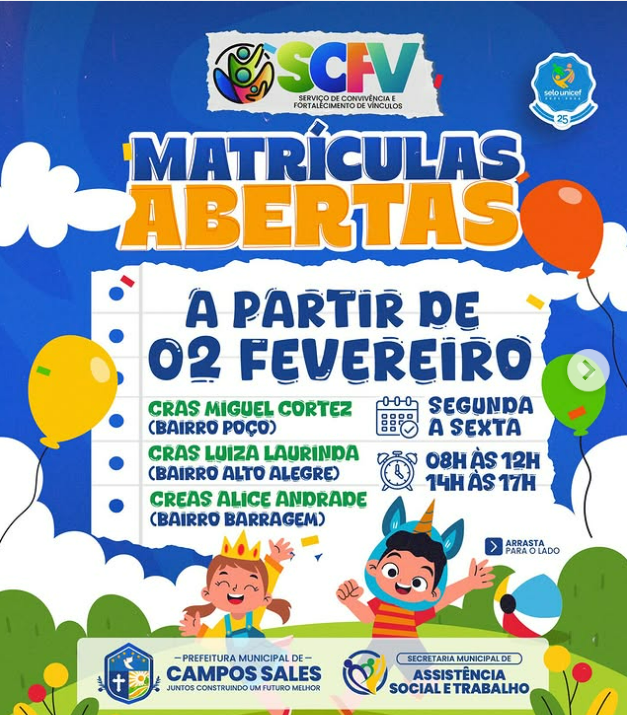 O Serviço de Convivência e Fortalecimento de Vínculos oferece atividades em grupo, oficinas educativas, culturais, recreativas e esportivas, com o objetivo de fortalecer os vínculos familiares e comunitários, promover a convivência social, prevenir situações de risco e contribuir para o desenvolvimento social e emocional dos participantes, garantindo mais inclusão, cidadania e qualidade de vida para a comunidade.
