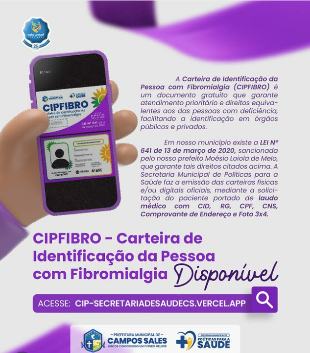 A Secretaria Municipal de Saúde informa que já está disponível a Carteira (Digital) de Identificação da Pessoa com Fibromialgia, através do site: