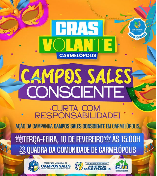 Pensando nisso, o CRAS Volante chega à comunidade de Carmelópolis com uma ação especial da campanha Campos Sales Consciente, levando informação, orientação e conscientização para um Carnaval mais seguro e responsável.