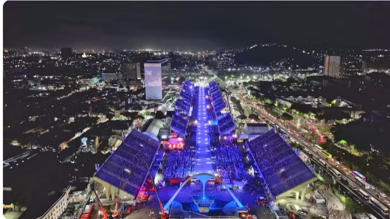 Vista do Sambódromo da Marquês de Sapucaí a partir da Apoteose neste domingo (15) — Foto: Reprodução/TV Globo