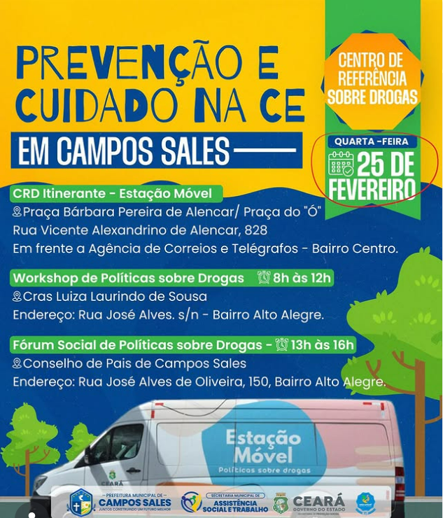 Em parceria com o Governo do Estado, Campos Sales receberá nesta terça, dia 25 de fevereiro, a partir das 8h, uma unidade móvel do Centro de Referência sobre Drogas que ficará na Praça do Ó, com vários profissionais e atividades relacionadas a Políticas sobre Drogas.