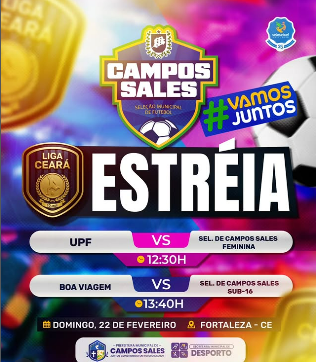 Pela primeira vez, Campos Sales terá duas seleções representando nossa cidade na Liga Cearense de Futsal: a Seleção Municipal Feminina de Futsal e a Seleção Municipal de Futsal masculino Sub-16. Um marco esportivo que enche nossa cidade de orgulho e esperança.