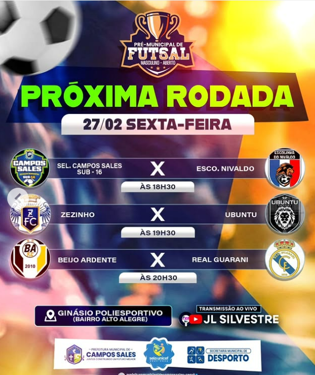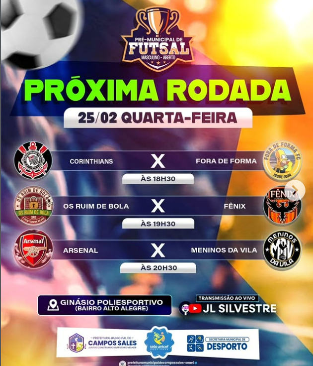 CAMPOS SALES\ESPORTE: FUTSAL QUARTA E QUINTA-FEIRAS, NO POLIESPORTIVO, NO CANAL DO YOU TUBE, JL SILVESTRE