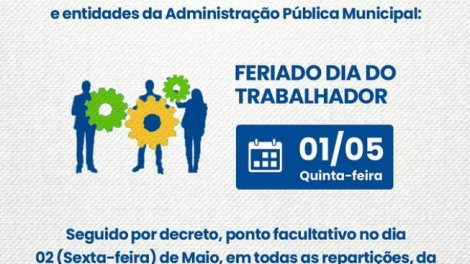 Conforme o DECRETO N° 023 - 30/04/2025, em virtude do feriado do DIA DO TRABALHADOR, informamos ponto facultativo em todos os órgãos e entidades da...