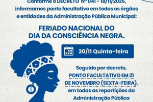 Conforme o DECRETO N° 041 - 18/11/2025, informamos ponto facultativo em todos os órgãos e entidades da Administração Pública Municipal.