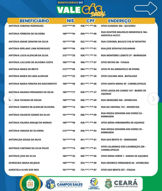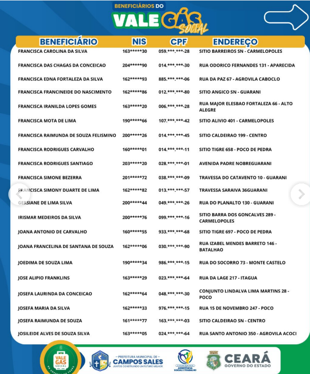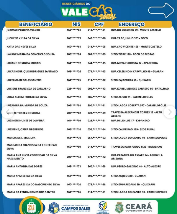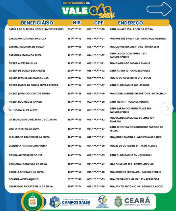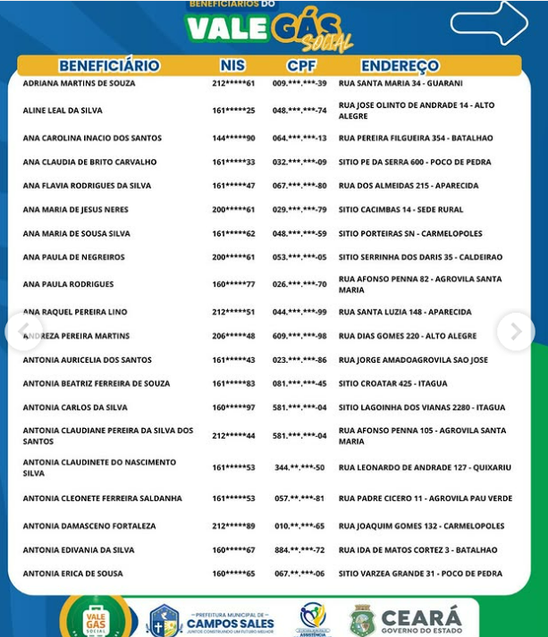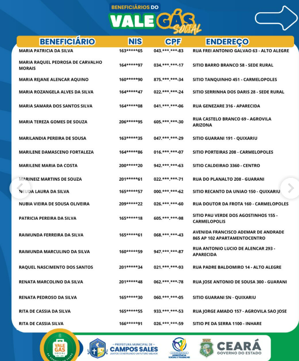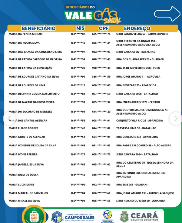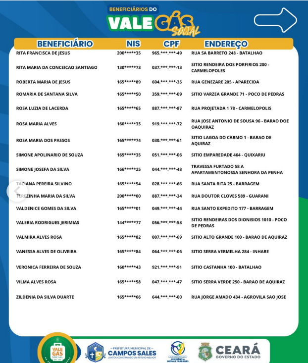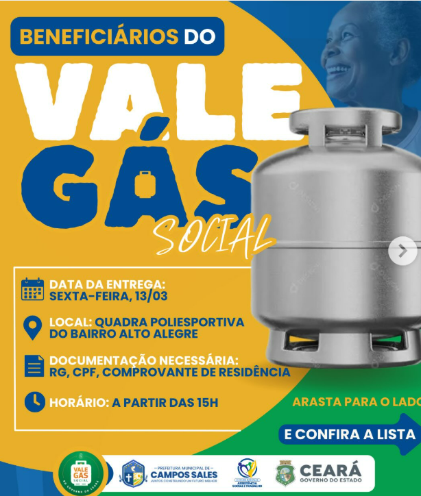 A Prefeitura Municipal de Campos Sales, por meio da Secretaria de Assistência Social, realizará a entrega do Vale Gás Social para as famílias contempladas.
