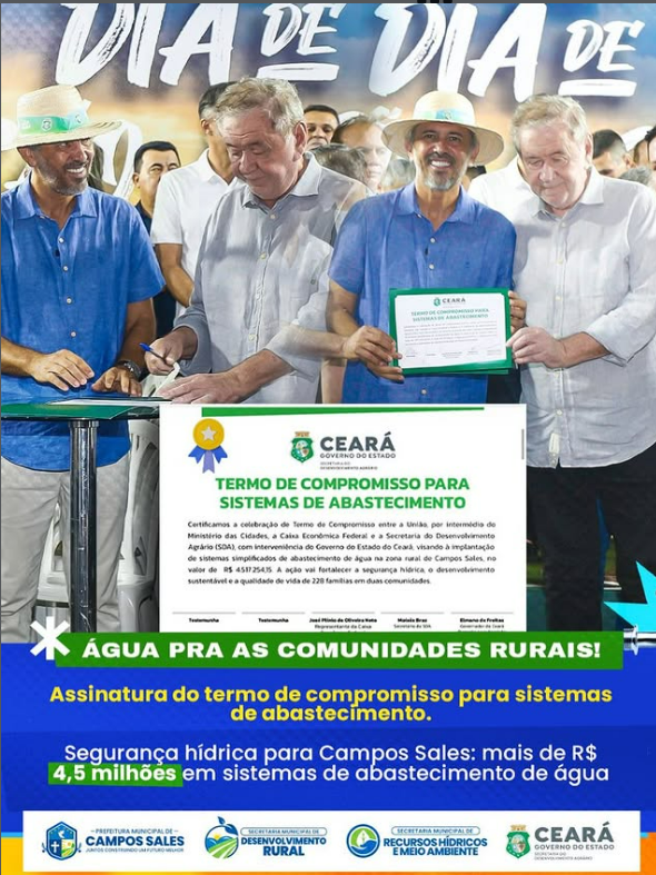 Foi celebrado um Termo de Compromisso entre a União, por meio do Ministério das Cidades, a Caixa Econômica Federal, a Secretaria Estadual do Desenvolvimento Agrário (SDA) e o Governo do Estado do Ceará, com interveniência do Governo Municipal, para a implantação de sistemas simplificados de abastecimento de água na zona rural de Campos Sales.