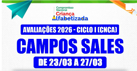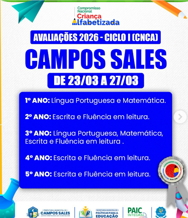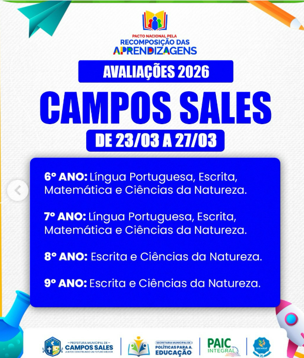 Avaliações 2026 | Campos Sales • 23 a 27 de março. Confira as disciplinas por ano e fique atento ao cronograma!