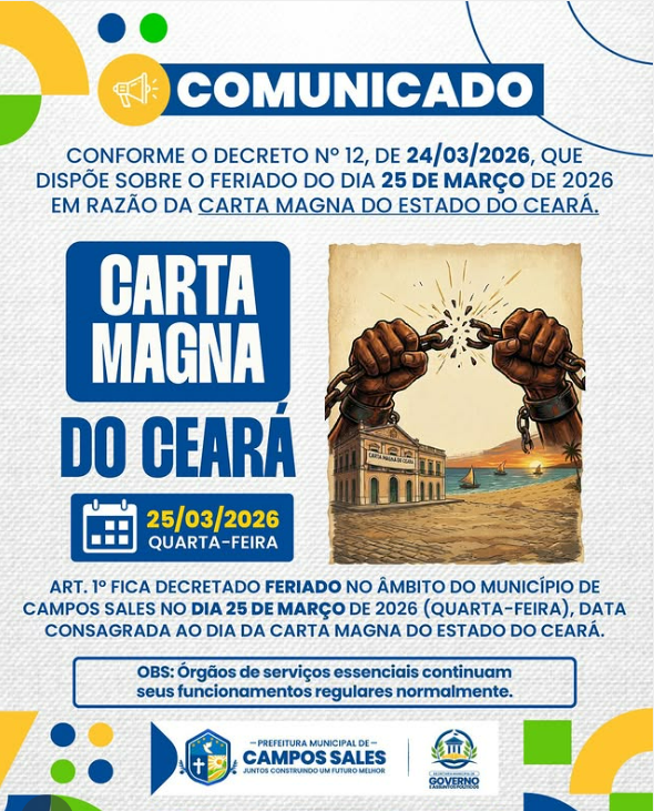 Conforme o DECRETO N° 12 – 24/03/2026, que dispõe sobre o feriado do dia 25 de março de 2026, em razão da Carta Magna do Estado do Ceará, informamos FERIADO, em todos os órgãos e entidades da Administração Pública Municipal: