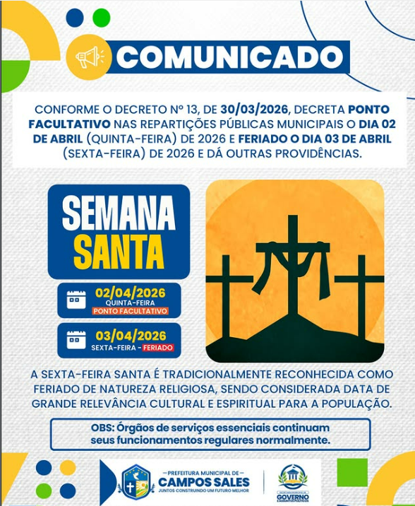 Conforme o DECRETO N° 13 – 30/03/2026, que dispõe sobre o feriado do dia 03 de abril de 2026, informamos PONTO FACULTATIVO E FERIADO, em todos os órgãos e entidades da Administração Pública Municipal: