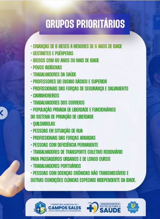 A imunização é destinada aos grupos prioritários (confira na imagem), que devem procurar a unidade mais próxima para garantir sua proteção. A vacina é segura, gratuita e fundamental para prevenir casos graves da doença, especialmente neste período de maior circulação do vírus.