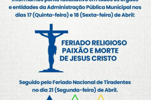 Conforme o DECRETO N° 018 - 14/04/2025, informamos ponto facultativo em todos os órgãos e entidades da Administração Pública Municipal nos dias 17 (Quinta...