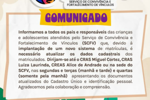 Dirijam-se até o CRAS Miguel Cortez, CRAS Luiza Laurinda, CREAS Alice de Andrade ou na sede do SCFV, nas segundas e terças (manhã e tarde) e quartas (somente...
